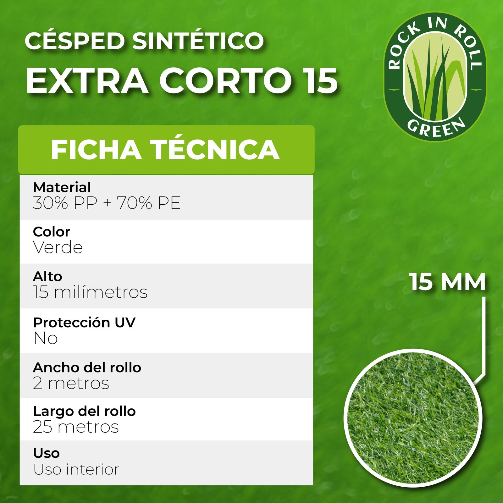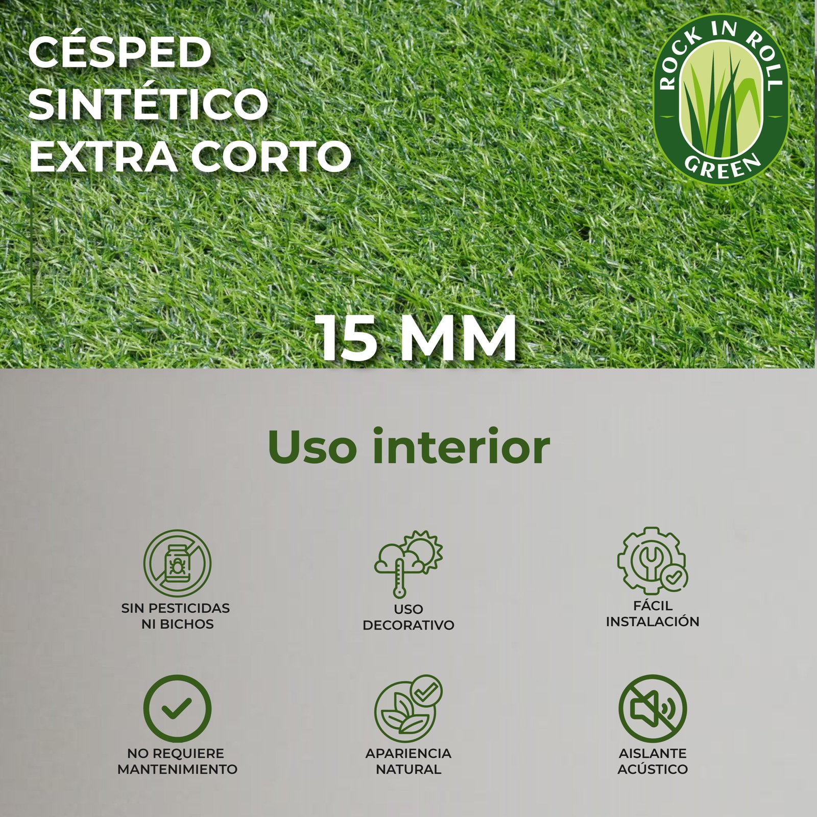 El Césped Decorativo de 15 mm es una excelente opción para espacios interiores, ofreciendo mayor densidad y suavidad que el césped de 10 mm. Con un aspecto más realista y agradable al tacto, este césped es perfecto para decoraciones temporales y proyectos de ambientación en interiores.